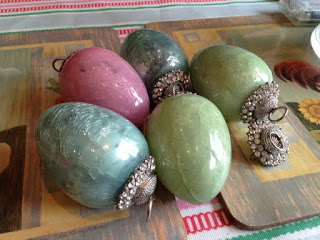 My favourite Easter decorations are these beautiful glass eggs that The hubs bought for me last year, on Saturday night I thought I'd do us a nice meal and set the table etc, I laid the table basically but nicely (even taking off the oilcloth!!!) and laid a glass on top of our napkins, Thomas was a nightmare, totally refused to go to bed he ended up grabbing one of the napkins and now my beloved glass eggs have gone from 6 to 5. I guess one of the perils of having a 15 month old wandering about!!!