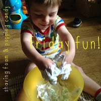 I wanted something that wasn't too messy but that would be fun, so we tried a bowlful of shaving foam with popping candy. It's no secret that T loves shaving foam and as a 'clean' 'non food' messy play it ticks my boxes too! I had some popping candy hanging around the house and so we added that into the mix.