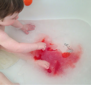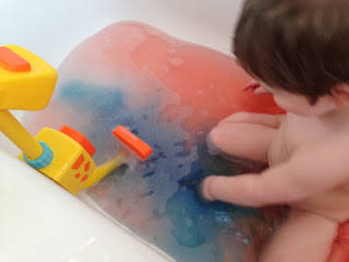 This week it seems that spring has arrived in the uk, earlier this week I collected Thomas from work a bit early and we spent some time in the garden, he loved stripping down to his vest and playing in a big water tub. He got a bit cold so I took him indoors - screaming!!! I ran him a bath to warm him up but he just wanted to go outdoors, I knew I needed something more to entice him into the bath - the food colouring. I put a few drops of red in and he couldn't wait to get in and play! He swirled the colouring with his hand and smiled and giggled, I then added some blue at the other end. This was a really cheap and easy activity for us to do and certainly be doing it again.