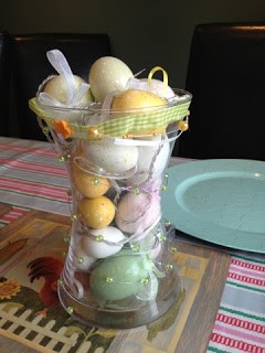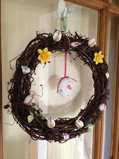 My favourite Easter decorations are these beautiful glass eggs that The hubs bought for me last year, on Saturday night I thought I'd do us a nice meal and set the table etc, I laid the table basically but nicely (even taking off the oilcloth!!!) and laid a glass on top of our napkins, Thomas was a nightmare, totally refused to go to bed he ended up grabbing one of the napkins and now my beloved glass eggs have gone from 6 to 5. I guess one of the perils of having a 15 month old wandering about!!!