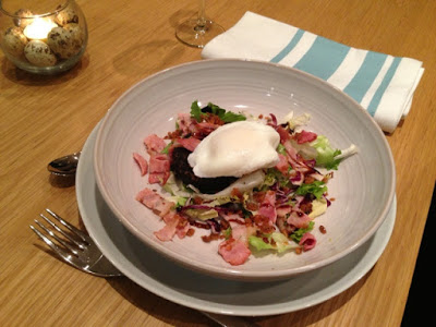 Place the salad leaves and tomato on a plate, mix dressing ingredients and drizzle over the top, sprinkle with the fried breadcrumbs, drizzle a little balsamic glaze. Scatter the bacon round the plate, place the black pudding on top of the salad then add the egg on top of that.