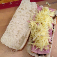I started off by spreading the panini with marmite, I then added ham and topped with cheese.  I popped these in the microwave for 1 minute to melt the cheese, once the cheese was melted I put the panini in a really hot frying pan to toast the outside.  It worked like a charm.