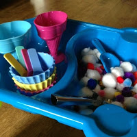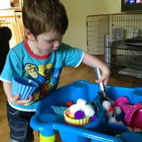 We are really making the most of our sensory table, I've been trying to think of things around the house that I can mix in with items from our play box rather than buying new things to play with. When I emptied the pom-poms into the tray, T took some new ice cream dishes from the kitchen counter and started filling them up!