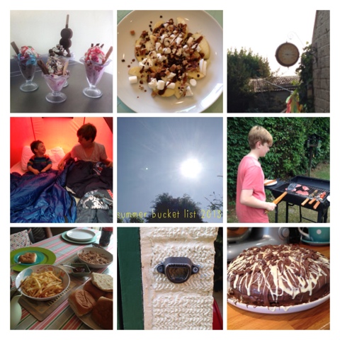 Clockwise - eat ice-cream sundaes, make apple nachos, put up an outdoor clock, H's BBQ, choccywoccydoodah inspired cake, put up an outdoor bottle opener, make pulled pork and