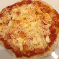 We used cheddar this time as it was on offer and we have a huge block but mozzarella is much nicer and not as heavy. The hubs and kids had ham, pepperoni and chicken on theirs. H is a little pineapple fiend too and loaded his with it.