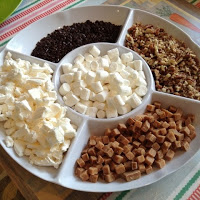 Our toppings - crushed up meringue nests, fudge pieces, chopped pecans, mini marshmallows and chocolate sprinkles.