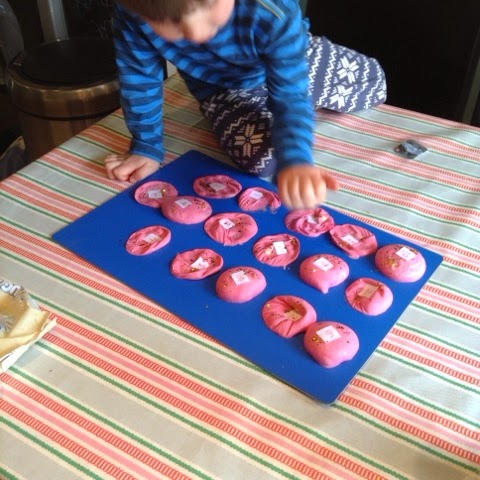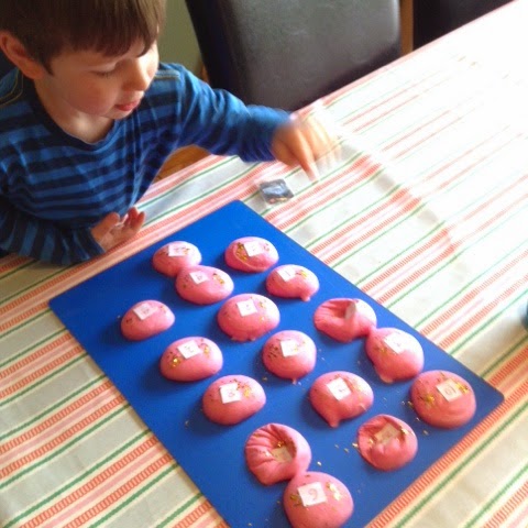 The recipe I followed can be found in this post I added some red food colouring (grrrr which turned pink!) and a little gold glitter.  I was looking for a blue and red superhero theme.